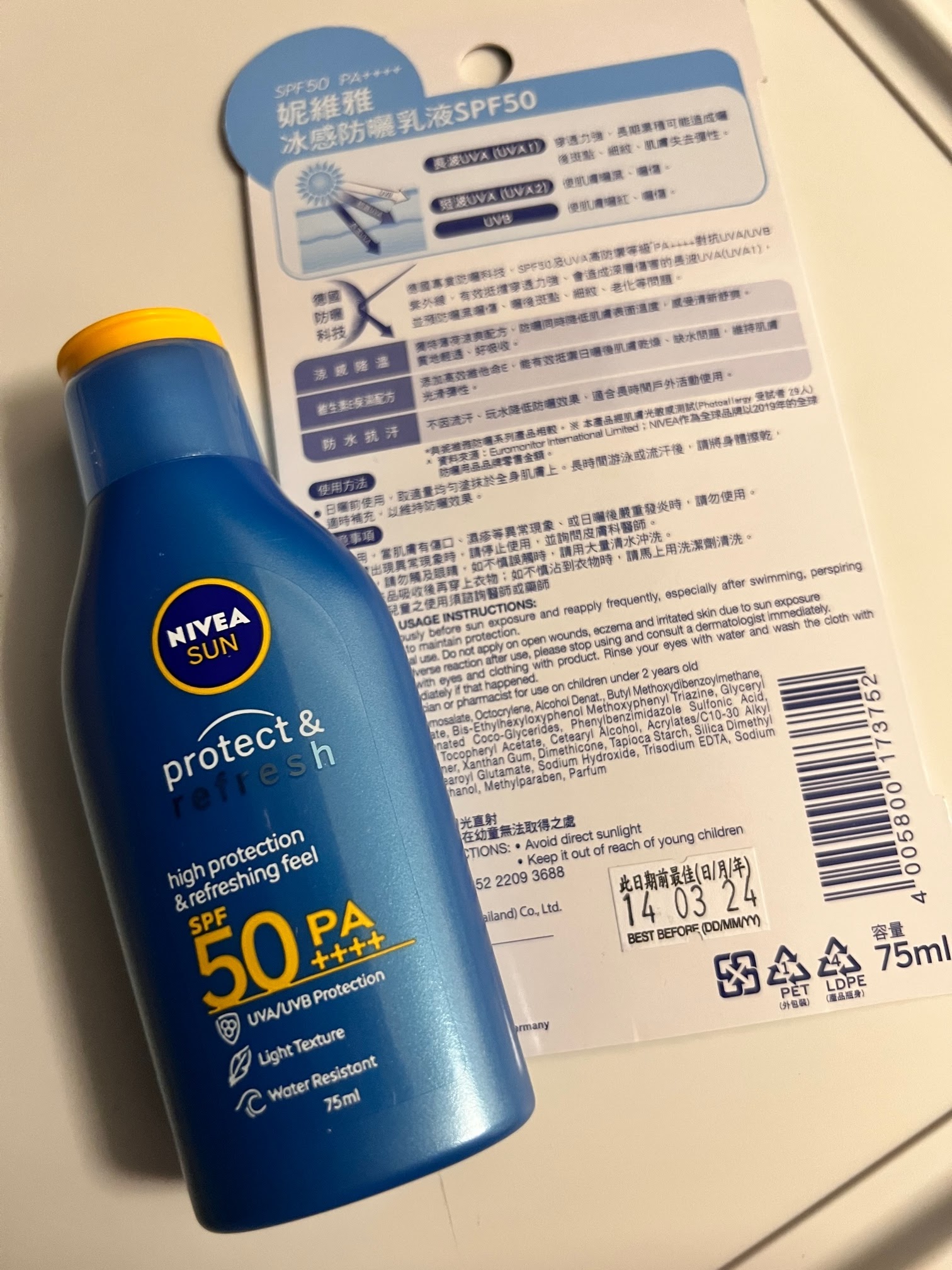 其實香港夏天真係出名又濕又熱,所以我去效外或者海灘最鐘意用呢款NIVEA 涼感高效防曬乳液 ,防曬度高達 SPF50 PA++++ ,同時加入高效維他命 E ,有效阻擋長波 UVA ,德國專業防曬科技,頑強防禦 UVA / UVB ,有效抵擋穿透力強,會造成深層 傷害的長波 UVA UVA1 ,有效預防曬黑曬傷,曬後斑點印,細紋,老化等問題,最正可以高度防水防汗,最鐘意個種冰涼感覺,超清爽不黏笠,耐久防禦,適合長期戶外活動使用。高效防曬護膚,添加高效修護維他命 E ,有效抵抗禦日曬後肌膚乾燥 缺水問題,維持肌膚柔軟彈性,用完真係全日感覺都好好呢 ^^